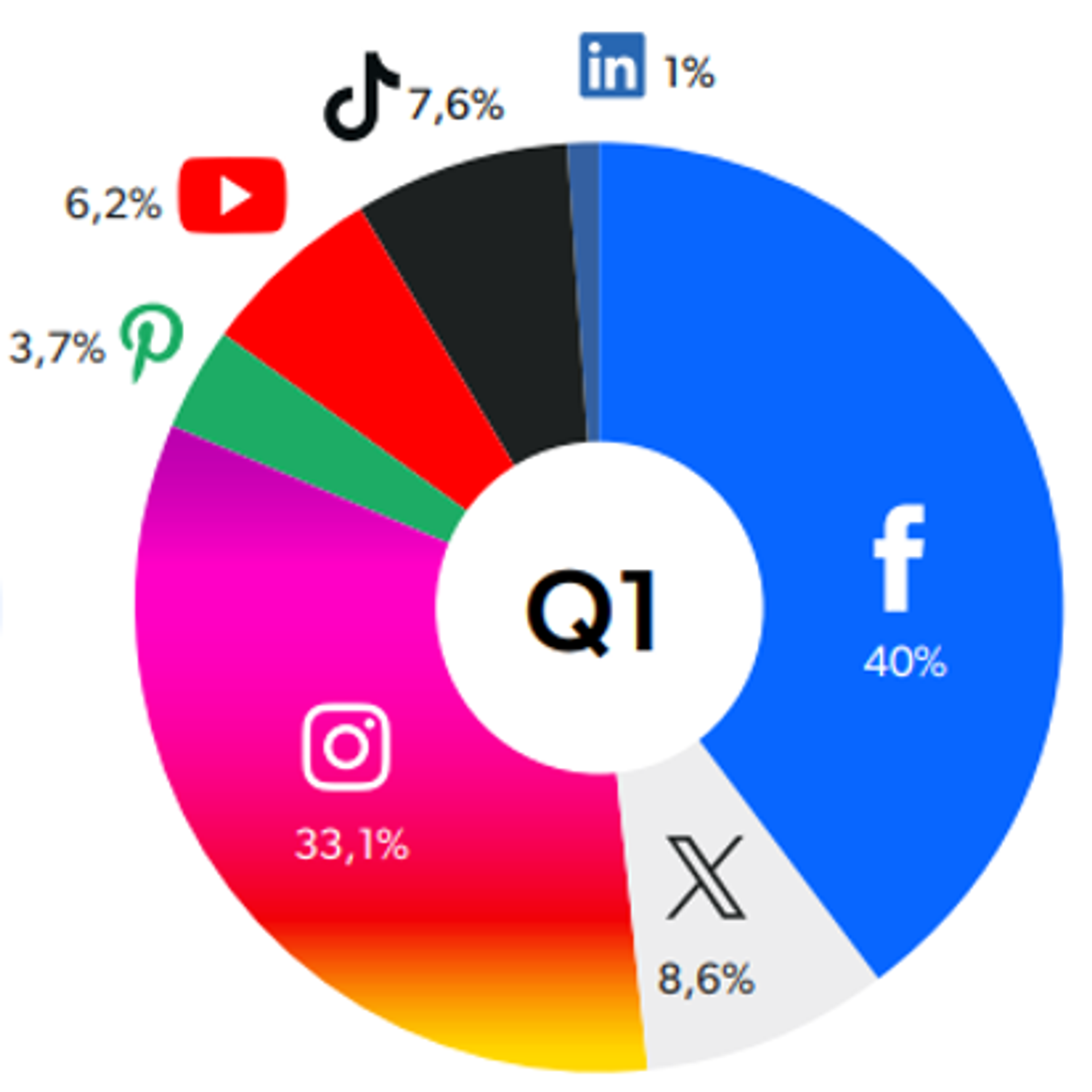 Facebook behoudt met 40% nog steeds het grootste aandeel, gevolgd door Instagram (33%) en TikTok (8%), dat inmiddels bijna gelijk staat aan X (9%). Daarna volgen YouTube (6%), Pinterest (4%) en LinkedIn (1%).